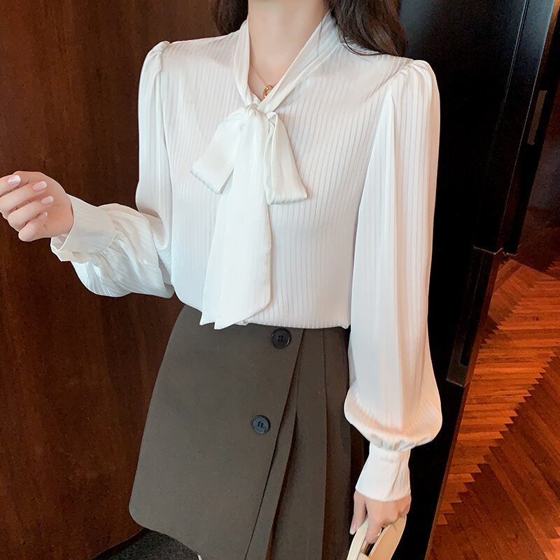 エレガントで女性らしいリボンデザインが魅力の長袖シャツです。通勤や通学、オフィスでのお仕事にもぴったりなデザインとなっています。シンプルなデザインながらも、リボンがアクセントとなり、一気に華やかさをプラスします。