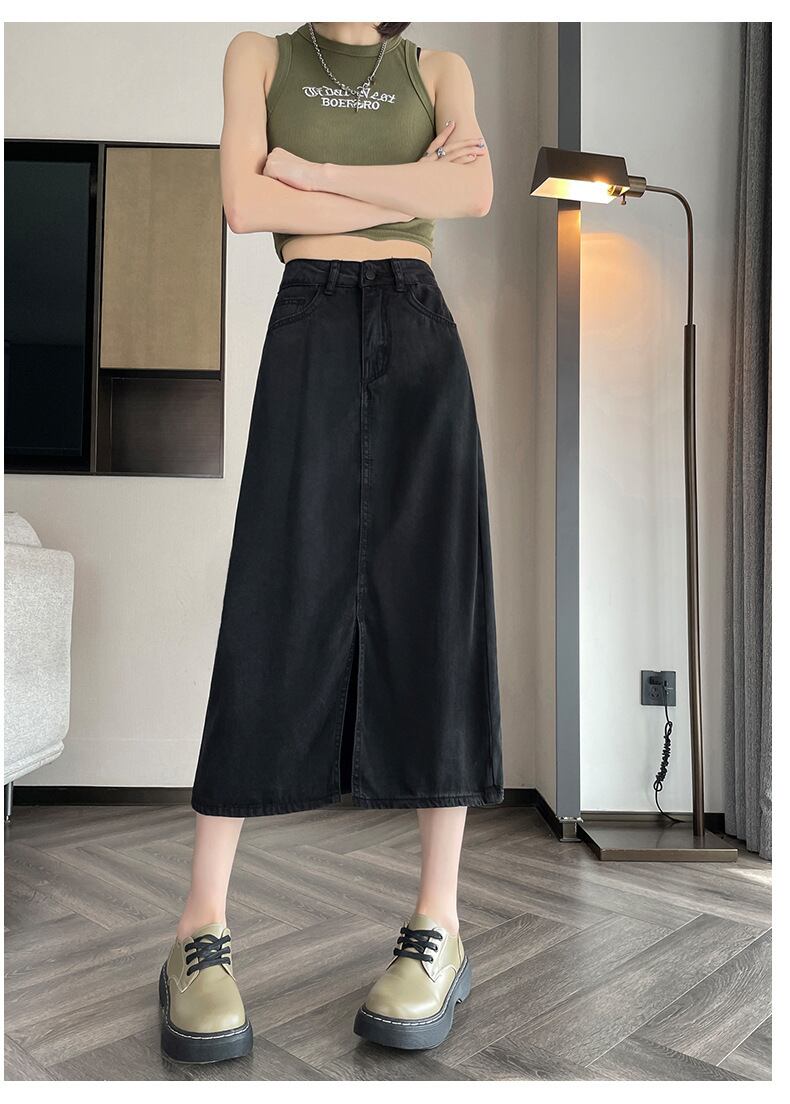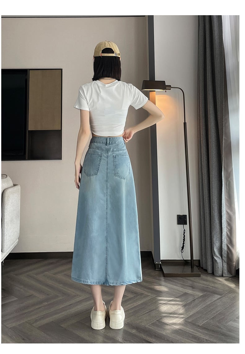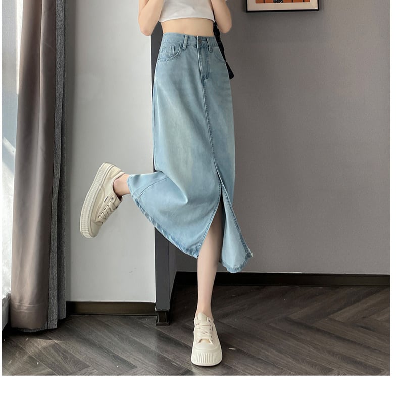デニムスカート アイスシルク ハイウエスト ミッドレングススカート