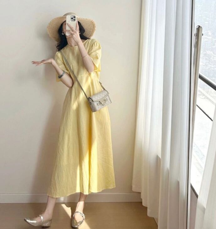 爽やかなイエローカラーが特長の夏ワンピースが登場!Aラインで体型カバーも叶えつつ、ハイウエストで脚長効果も◎。暑い季節にはもちろん、羽織ものを合わせて秋まで長く着用いただけます。